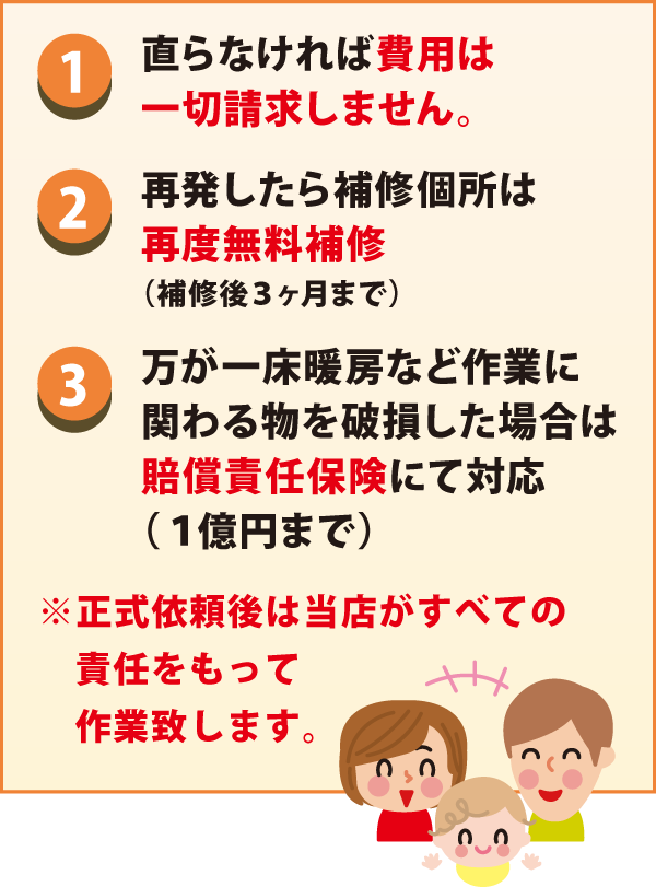当店は床鳴りに関しては全て直せる自信があるため安心して頼めるシステムを考えました。